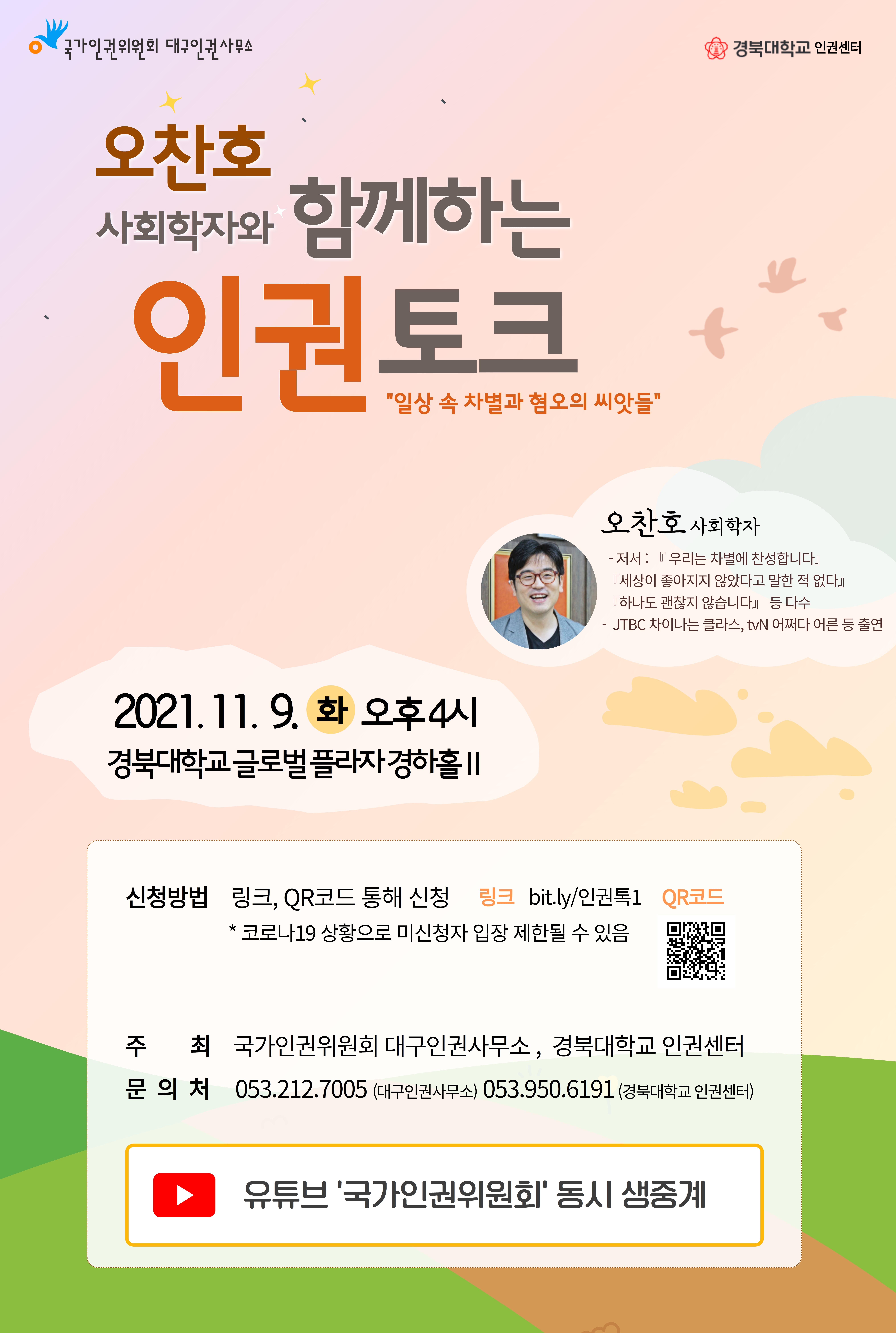 인권감수성 제고 및 인권친화적 대학문화 조성을 위해 국가인권위원회와 협력하여 대구·경북 지역 대학(원)생을 대상으로 인권토크콘서트를 다음과 같이 개최합니다.