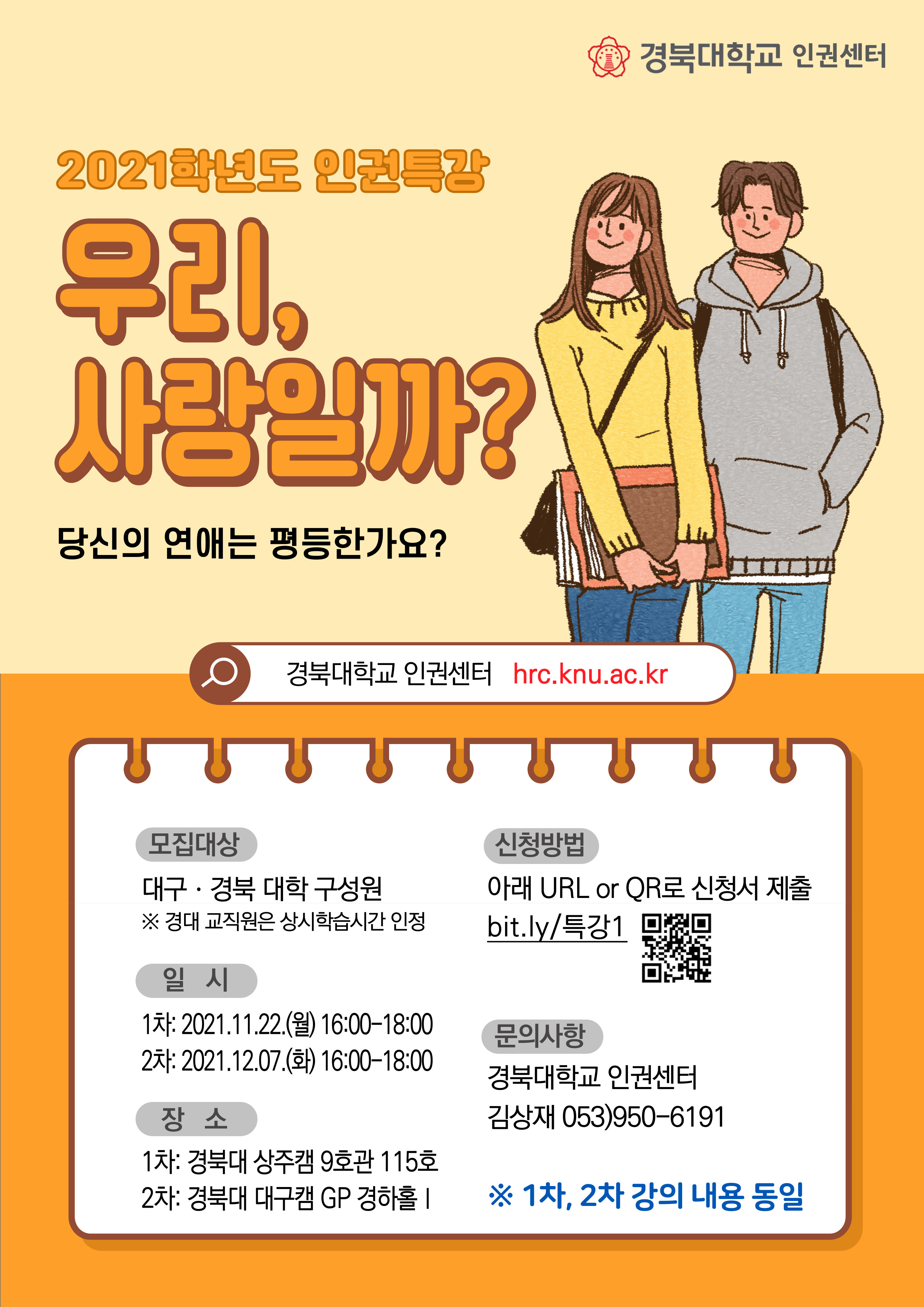 - 신청: 인터넷 URL(평등한 연애: bit.ly/특강1, 대화의 기술: bit.ly/특강2)을 통한 온라인신청